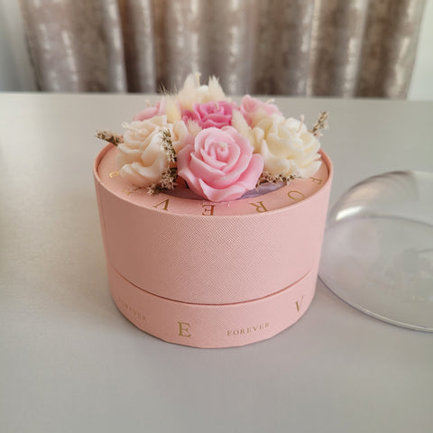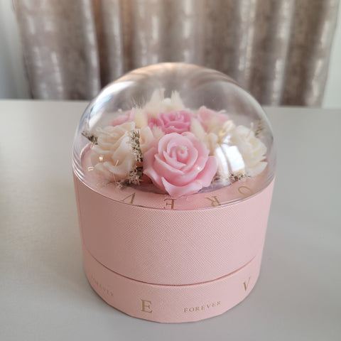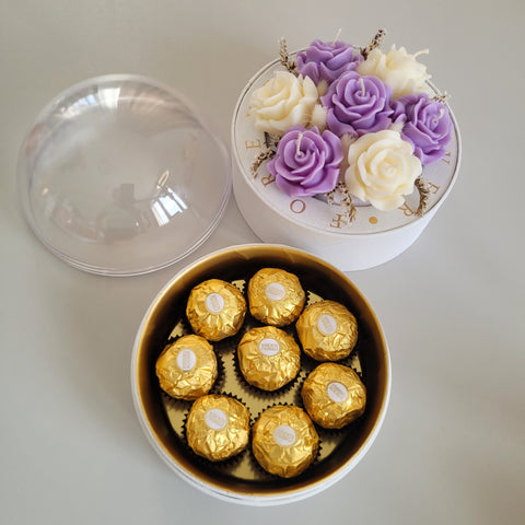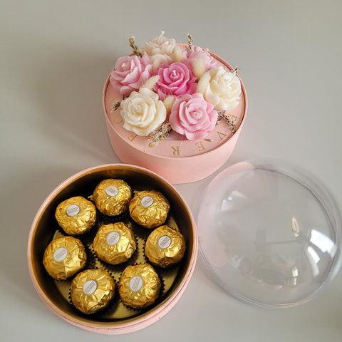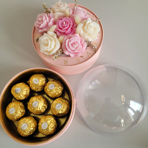 Florile sunt așezate cu grijă într-o cutie rafinată, prevăzută cu un compartiment special pentru ciocolată – combinația perfectă între frumusețe și răsfăț. Capacul tip dome din acrilic transparent oferă un efect spectaculos, protejând aranjamentul și punând în valoare fiecare detaliu.